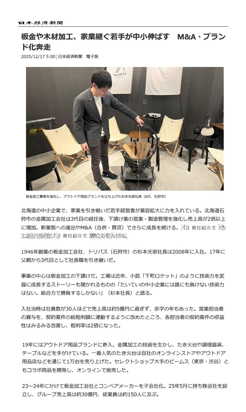 2025年12月17日付の日本経済新聞にて、トリパスの取り組みが紹介されました。 代表・杉本光崇が家業の板金加工事業を継承し、アウトドア用品ブランドとしても新たな価値を創出している姿が取り上げられています。 M&Aやブランド戦略を通じて中小企業の可能性を広げる若手経営者として、北海道・石狩市から全国へ挑戦を続けています。